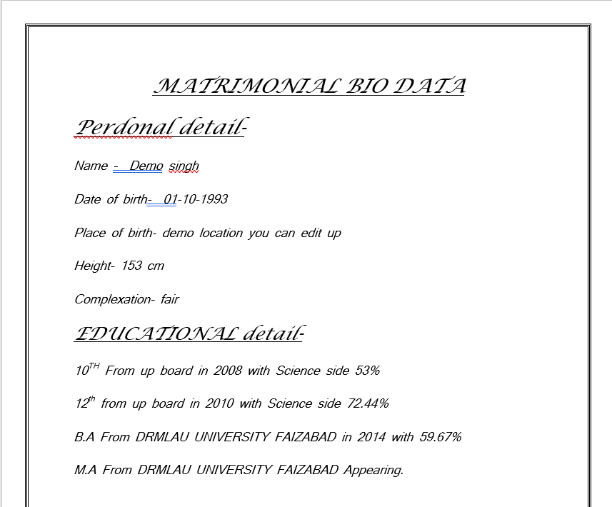 A matrimonial resume, also known as a marriage biodata or marriage CV, is a document that summarizes a person’s details to help them find a suitable partner. It’s similar to a CV or resume, but with a focus on finding a romantic match